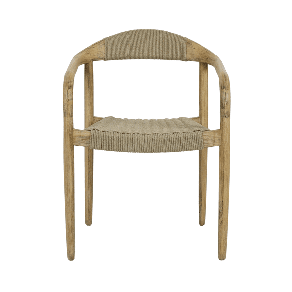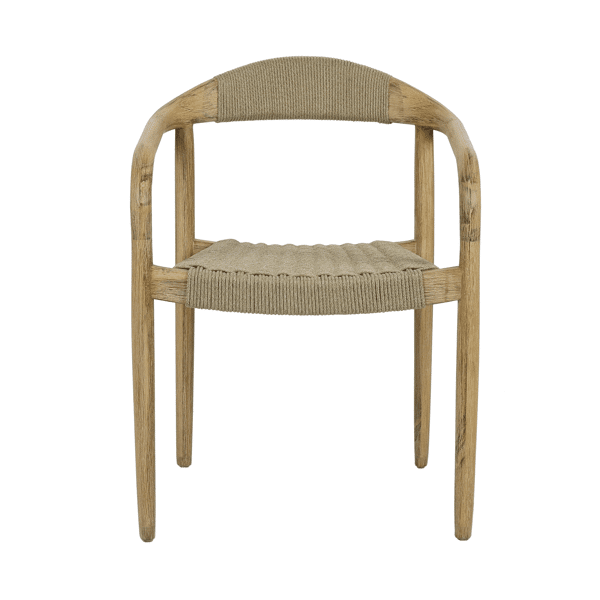 The Mira chair combines solid acacia wood with a handwoven rope seat for a warm, crafted look. Its rounded shape and airy design make it perfect for both indoor and outdoor use. Available in a natural finish or with a playful green rope accent.
