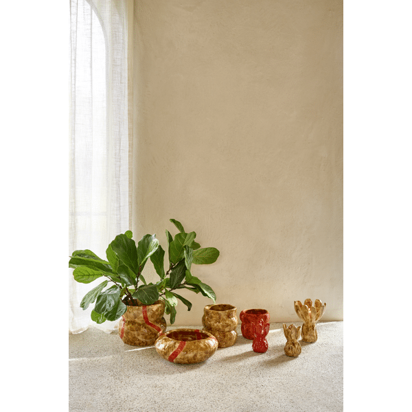 De maNi collectie is geïnspireerd op een wandeling langs de ruige kustlijnen van Altea en Calpe in Spanje. De ruwe vormen van de rotsen in Calpe vormden de basis voor het ontwerp en vangen de kracht en authenticiteit van de natuur. De kleuren weerspiegelen de zachtrode zeeanemoon, een kwetsbaar diertje dat zijn thuis vindt tussen de ruwe stenen aan de kust. Een contrast dat onze eigen zoektocht naar zachtheid in de hardheid van de wereld weerspiegelt.Deze collectie is zorgvuldig met de hand gemaakt, wat zorgt voor natuurlijke barsten in de klei.