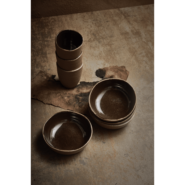 Igni is meer dan servies, het is een ode aan het vuur: rauw, krachtig en vol betekenis. De naam komt van Ignis Spectatus, Latijn voor “die de vuurproef heeft doorstaan”. En dat voel je in elk stuk. De collectie is gemaakt van gerecycleerde en gebakken kleiresten, klei dat al één keer door het vuur ging en nu een tweede leven krijgt. Door het hoge ijzergehalte ontstaat tijdens het bakken een warme, roestige gloed. Zelfs de restjes die het vuur niet overleven, worden opnieuw verwerkt. Ze geven het servies een ruwe, korrelige textuur die je ziet én voelt. Igni herinnert aan het vuur dat mensen samenbracht, dat kookte, verwarmde en verhalen deed ontstaan. Elk stuk is een tastbaar bewijs van die oerkracht.