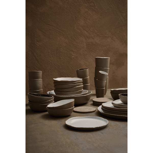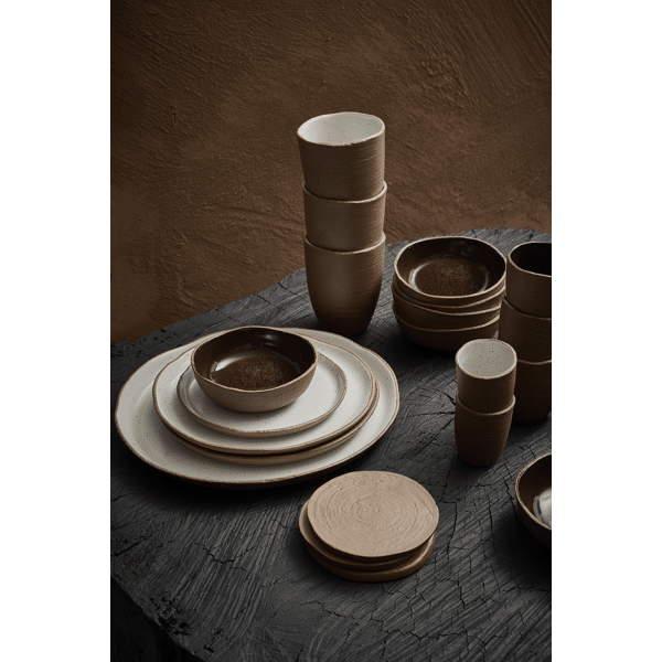 Igni is meer dan servies, het is een ode aan het vuur: rauw, krachtig en vol betekenis. De naam komt van Ignis Spectatus, Latijn voor “die de vuurproef heeft doorstaan”. En dat voel je in elk stuk. De collectie is gemaakt van gerecycleerde en gebakken kleiresten, klei dat al één keer door het vuur ging en nu een tweede leven krijgt. Door het hoge ijzergehalte ontstaat tijdens het bakken een warme, roestige gloed. Zelfs de restjes die het vuur niet overleven, worden opnieuw verwerkt. Ze geven het servies een ruwe, korrelige textuur die je ziet én voelt. Igni herinnert aan het vuur dat mensen samenbracht, dat kookte, verwarmde en verhalen deed ontstaan. Elk stuk is een tastbaar bewijs van die oerkracht.