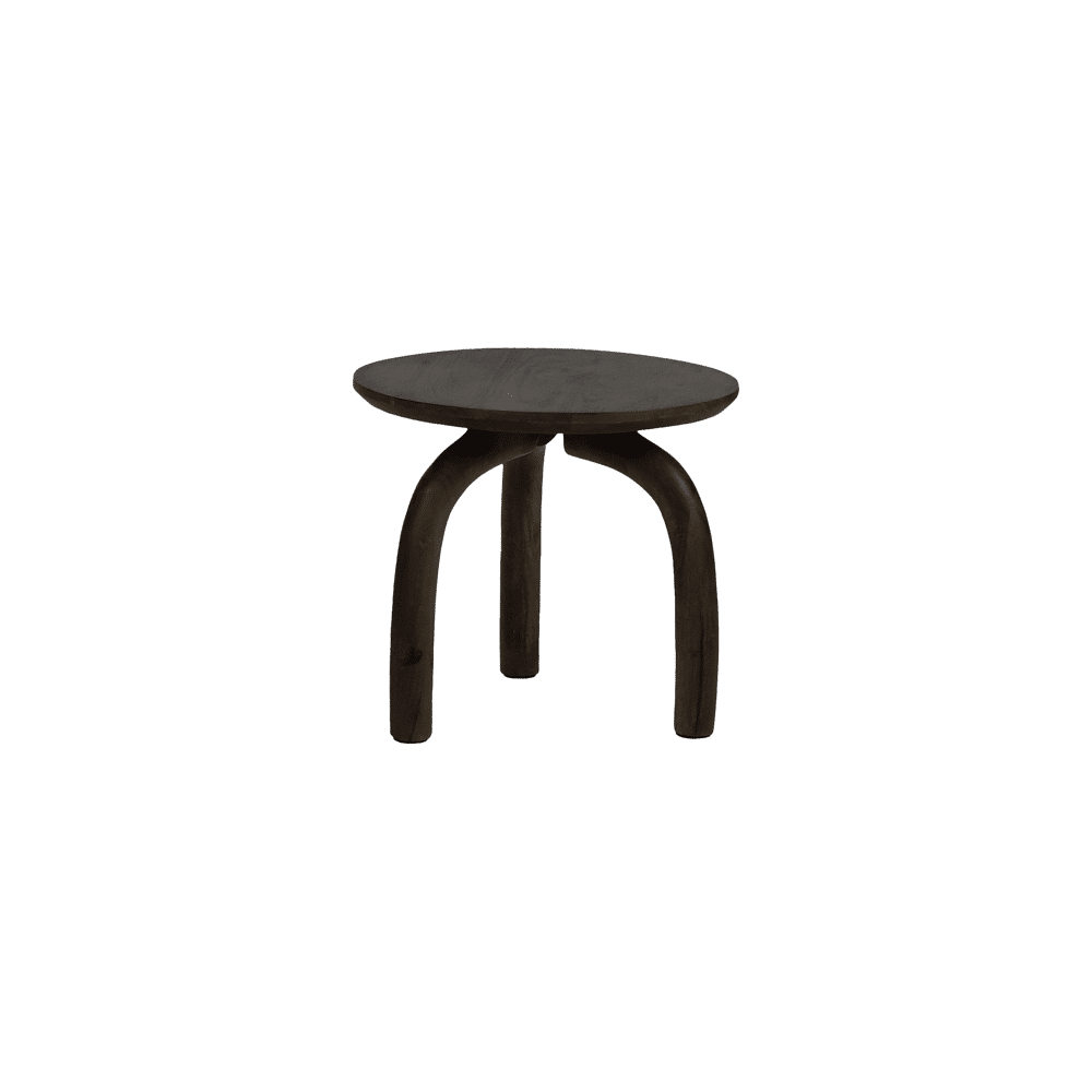 De kracht van Trilo zit in de eenvoud van zijn ontwerp. Een rond blad in donker mangohout rust op drie sculpturale poten, die de tafel zijn naam en zijn karakter geven.